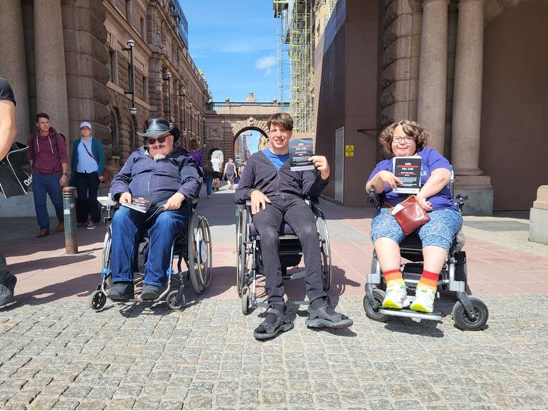 Gör funktionsrättskonventionen till lag är en tyst aktion utanför Sveriges riksdag som syftar till att göra funktionsrättkonventionen till svensk lag. Vi delar ut flygblad och pratar med förbipasserande som vill veta mer.